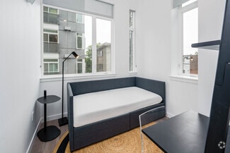 · Amenities include a panoramic rooftop deck overlooking Elliot Bay and South Lake Union, a firepit and grill, air conditioning on the top two floors, secured 24-hour access, a lobby lounge with Wi-Fi and workstations, and a communal kitchen with multiple cook stations and eating areas.