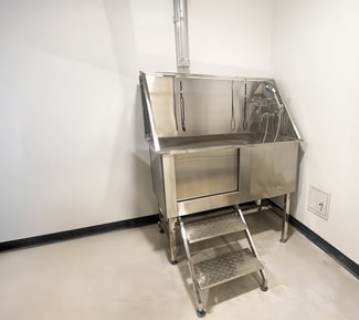Alt Flats features nine floors, a rooftop outdoor amenity space, shared laundry facilities with large commercial-grade washers and dryers, a pet wash station and relief area, 82 bicycle racks, and floor-to-ceiling windows providing abundant natural light.