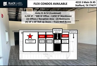 Units 51 & 52 (Combined) 3,250 SF : ~400 SF Office – 2,850 SF Warehouse (2) Offices / Reception Area - (2) Restrooms (4) 10’ x 10’ Roll Up Doors – Truck Well Access Unit 55 (Individual Unit) 1,625 SF : ~200 SF Office - ~1,425 SF Warehouse (1) Office / Reception Area - (1) Restroom (2) 10’ x 10’ Roll Up Doors – Truck Well Access
