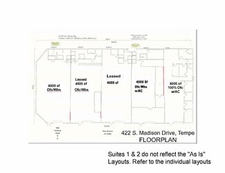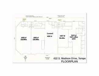 422 Madison is a well located multi-tenant industrial building near the Heart of Tempe. Offering suites totaling 4500 sf, with various build-outs and configurations. Located in the Tempe sub-market, 422 Madison offers great access to the 143/202 or I-10 Freeway system.... * Prime Tempe Location near ASU, Skyharbor Airport and Freeways * 22,500 sf Office/Warehouse * 4,500 SF Suites w/Rollups available * Between I-10, 202, & 60 Freeways