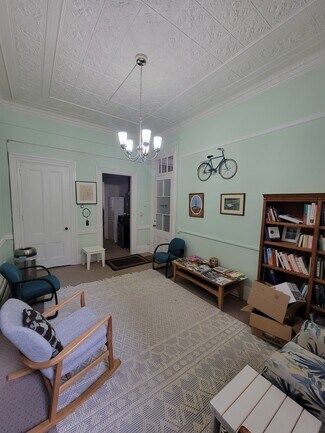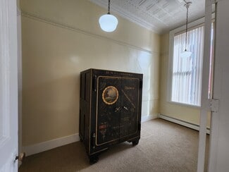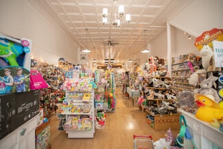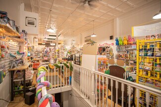This expansive 13,380-square-foot building offers a diverse income stream, featuring retail, office, and residential spaces, perfect for investors or owner-occupants. The first floor features two retail storefronts. One is a 1,540-square-foot space currently leased to a toy store, complete with a kitchenette, a half bath, rear offices, and access to a finished basement. The second, a 5,000-square-foot vacant store front, presents an excellent owner-occupied business or value-add leasing opportunity. Previously home to a gift shop for over 40 years, it boasts an elegant mezzanine overlooking the showroom, a break room, kitchen, half bath, and ample storage. The first floor also includes additional rear storage, offices, and full basement access.