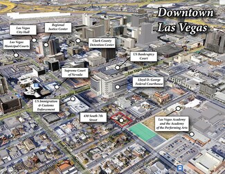 The property is located in the heart of downtown Las Vegas, offering immediate proximity to the city's legal and government hub. It is situated just steps away from the Regional Justice Center (200 Lewis Avenue) , Las Vegas Municipal Court (100 E Clark Avenue) , the US Bankruptcy Court (300 Las Vegas Boulevard South) , and the Clark County Detention Center (330 S Casino Center Blvd). The location also provides easy access to major thoroughfares and other key government buildings. This central location is ideal for attracting legal and professional clients and offers a prestigious business address.
