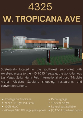 16,900 SF single purpose building with frontage on W. Tropicana Avenue. Open floor plan, 4 offices, conference room, skylites, and exposed ceiling. Phone & data cable throughout. High speed data available. Corporate identity allowed on the building. Additional improvements can be built to tenant’s specifications.