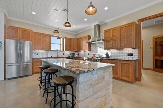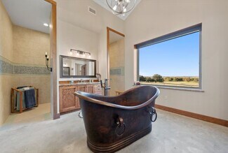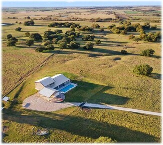 This is a one of a kind gem in central TX that sits at a Falls County highpoint. The views are unmatched. A truly remarkable working ranch and gorgeous home that offers numerous possibilities for recreation, hunting, cattle ranching and other income production. The home is 3-bedroom, 4-bathroom luxury home in Chilton, TX. Currently used as a short-term rental during the summer months, it can offer great investment income if used in this manner. Each bedroom is arranged as its own master suite. The main master bedroom is a personal retreat with cedar walk-in closet, bathroom with a walk-in shower, soaking tub, bidet and a kitchenette. The second primary suite is equally comfortable, with shower and double vanity and kitchenette. The upper-level bedroom also features bathroom and sleeping for three. The home has two tankless HW heaters, an indoor storm cellar and a hidden room. Kitchen appliances and wall mounted TVs convey. Outside amenities include resort-style heated pool, outdoor kitchen with built-in fridge, sink, and storage. Pool furniture conveys. Mature oaks throughout the ranch are second to none ... unbelievable. No restrictions, secluded, quiet, abundant wildlife and great fishing. The ranch is cross fenced and equipped with working pens. Three stock tanks and improved grass in all the pastures. The metallic barn is framed up on the interior for living quarters with central air and heat, bathroom and septic. Needs finishing, but is livable. There is an attached lean-to (1,600 SF) for equip. 3 RV hookups. The foundation of the previous home also remains beside the lake and would be great for an additional barn or bunkhouse (~1,200 SF). Great mix of open pasture with sporadic oaks and wooded areas. Three stock tanks and piped water outlets at numerous places. 2 septic tanks. 4 water meters. 3 electric meters. This place has it all and is truly one of the places you need to see to appreciate.
