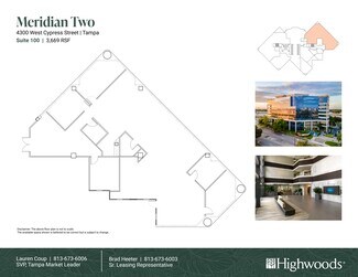Experience a dynamic work setting enveloped by a myriad of retail amenities at the heart of a rapidly expanding market at Meridian One and Two. The three-building office park is set in a serene environment flush with outdoor space that sparks creativity while offering easy ingress from W Cypress Street and signage opportunities that are visible from I-275. Tenants can take advantage of suites ranging in size from 1,148 to 23,880 square feet that provide both move-in ready and customizable options tailored to promote growth in addition to two delis on-site and the upscale Spark by Highwoods conference center. The property is also encircled by a variety of retail options, including Westshore Mall, which is home to Dick’s Sporting Goods, H&M, Victoria’s Secret, and Old Navy, and a host of other notable brands, such as Best Buy, Walmart, The Home Depot, Whole Foods, Publix, Barnes & Noble, and Nordstrom Rack, all within a four-minute drive. This, in conjunction with the ease of accessibility to the site via I-275 and brief eight-minute drives to Tampa’s central business districts and Tampa International Airport, provides a location that’s central to the best the area has to offer. This includes the Westshore and Midtown districts, a new mixed-use live-work-play development that exemplifies Tampa’s explosive growth with a myriad of shopping and living experiences minutes to Meridian. If convenience and connectivity in one of the nation’s fastest-growing markets are key, Meridian is the ideal destination.