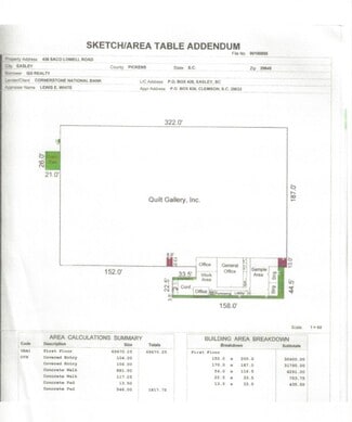 The Warehouse Ceiling Heights: 12' dot Deck, 9'6" under beams. Four (4)- 5-ton HVAC units in warehouse, Two (2)HVAC units in office Three (3) main 600 amp electrical panels. T-5 and T-11 lighting. State of the art surveillance system. Pickens County Tax Map numbers 5029-16-93-3684 and 5029-16-93-0746.