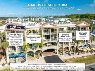 Prime commercial retail storefront on Scenic 30A in Santa Rosa Beach, Florida! This prime end-cap commercial space projects a strong presence on Scenic 30A in Santa Rosa Beach, Florida, and captures high visibility from the synergistic peripheral uses that include the mixed-use, entertainment development known as Gulf Place, and flanked by Shunk Gulley Oyster Bar & Papa Surf Burger Bar; all located directly across from the expansive and popular public beachfront park known as Ed Walline Regional Beach Access (located at 4447 County Hwy-30A W, Santa Rosa Beach, FL 32459). Abacos offers dedicated parking spaces for patrons, and the site has exceptional access from Highway 98 via County Road 393 and Scenic 30A. Please inquire for further details. Showings require a minimum of 48 hours...