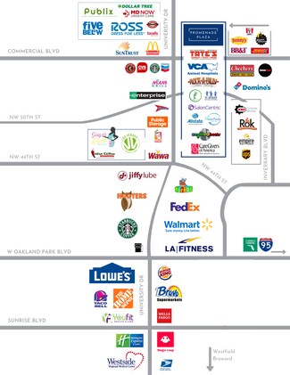 Promenade Plaza is located in the thriving high-density retail corridor on North University Drive, Lauderhill with exposure of 60,000+ cars travelling through on a daily basis. The plaza is positioned in Broward County and is surrounded by a dense residential area with significant retail stock. Neighboring tenants include the Crafty Crab Seafood Restaurant, VCA Animal Hospital, Tate's Comics, Beauty Salons, Bakery, Insurance Agencies, Professional & Medical Offices, Care Givers of America and many more!