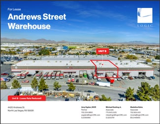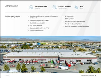 4420 Andrews St., Unit A, in North Las Vegas, NV, offers ±62,155 SF building on ±3.24 AC. Key features include 21' clear height, and ESFR sprinklers. Conveniently located near E. Craig Rd. and the I-15 Freeway, the property is zoned M-2.