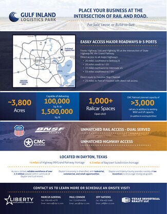 Seize the Gulf Coast logistics market with this opportunity to set up prolific distribution operations at the 3,800-acre site of Gulf Inland Logistics Park. Since its completion in May 2022, the Grand Parkway has provided Dayton with unprecedented access to major commercial destinations in Houston and throughout Texas, transforming the locale into a vital last-mile distribution hub. With this freeway expansion, Gulf Inland Logistics Park is now 30 minutes from Downtown Houston or the port and only 45 minutes from The Woodlands. However, this park is intended to reach far beyond the Greater Houston market. The entire development will be rail-served by CMC Railroad, BNSF Railway, and Union Pacific, with planned storage for over 2,700 railcars and existing facilities. Rail users will enjoy peace of mind with a planned full-service railcar repair facility and a state-of-the-art multi-commodity transload center with unit train capacity.