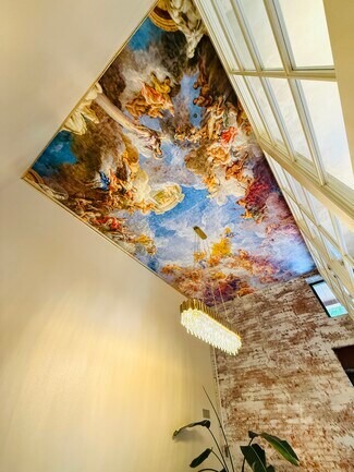 An entrance with soaring ceilings and natural light converge to create a breathtaking atmosphere. The main level welcomes you with an elegant modern reception and lobby, crowned by statement chandeliers that set the tone for sophistication. Four spacious private suites offer flexibility and privacy, while a stunning conference room elevates every meeting with its Versailles-inspired ceiling, gold-accented crystal chandelier, and a striking authentic brick accent wall. This remarkable property offers limitless potential to craft a space as dynamic and visionary as your ambition.