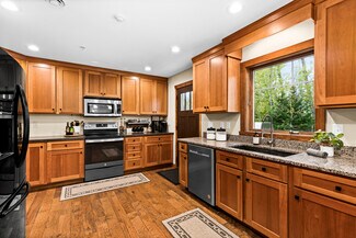 The layout includes a grand foyer, ideal for creating a welcoming reception or waiting area, a formal dining area, and a spacious Great Room with a gas fireplace. The kitchen features custom cherry cabinets and granite countertop — perfect for staff or communal use.