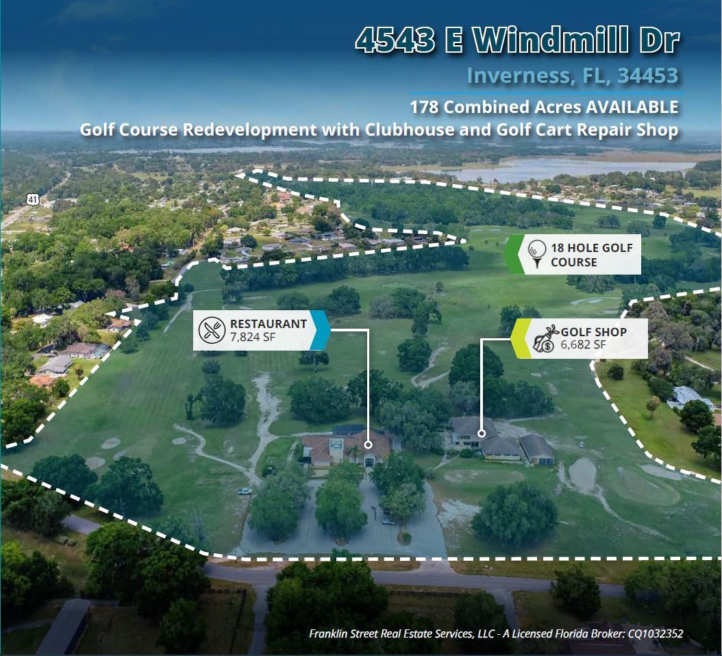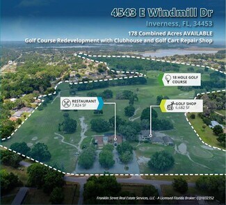 This 178-acre property presents a prime redevelopment opportunity of a former golf course in Inverness, Florida. The site includes existing amenity structures, including a large restaurant, golf shop, and maintenance facilities, which can be repurposed as part of a larger residential or mixed-use master plan. The land features significant green space, wetlands, and stormwater areas, already integrated into a conceptual site plan for future single-family and townhome developments.