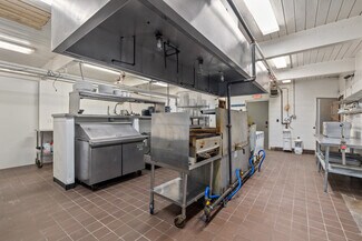The main building features approximately 6400 sf of space, including an industrial kitchen, a spacious main dining room, a bar and dining area with a double-sided fireplace between them, and a versatile banquet room measuring 31x34 with beautiful hardwood floors – perfect for hosting events. The walk-in freezer offers ample cold storage for food and beverages with multiple other dry storage areas throughout the establishment.