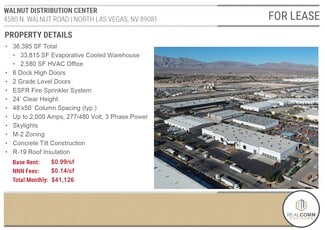 $0.99/sf Base Rent + $0.14/sf NNN Fee = $41,126 Total Monthly. This 36,395 SF industrial distribution unit includes 2,580 SF HVAC Office Area and the balance evaporative cooled warehouse serviced by 6 dock high loading doors, 24' clear height with ESFR fire sprinkler system, & up to 2,000 Amps, 277/480 Volt, 3 Phase Power. There is also a side & rear fenced yard area. See attached brochure with more details.