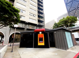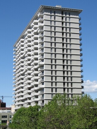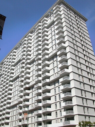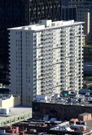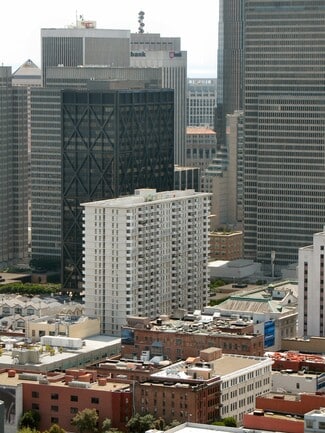 The residential portion was completed in 1967. It consists of two 22-story buildings, two 25-story buildings, and 58 townhouses. The housing units are constructed over twostory garages covered by landscaped plazas, which are accessible via pedestrian bridges and stairs from the street level. The commercial component includes approximately 62,000 square feet of office and retail space that includes Safeway, Bank of America, 42nd Moon Theater, Starbucks, and other restaurants/services.