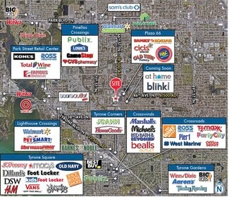 Regional access: quick connections to I-275, US-19, Tyrone/Tyrone Square area, Downtown St. Petersburg, and St. Pete–Clearwater International Airport (PIE) place the site within short drive-times to the metro’s employment, residential, and visitor bases (regional routes and mapping referenced). Waze/MapQuest