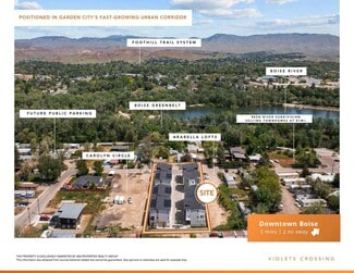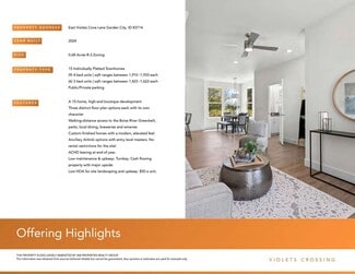 Unveil this exquisite 2024-built boutique development on 0.68 acres of R-3 zoned land at East Violets Cove Lane, Garden City, ID 83714. This high-end collection features 15 individually platted townhomes with three distinct floor plans: 9 expansive 4-bedroom units (1,910-1,933 sq ft) and 6 versatile 3-bedroom units (1,423-1,622 sq ft). Each townhome home boasts custom modern finishes with an elevated aesthetic, including entry-level master suites ideal for ancillary Airbnb opportunities.