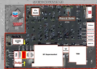 The Gary Beck of JW Michaels Commercial is pleased to present Spring Oaks Shopping Center. It will be transformed into the Center of Universe Asian Community within World Famous City of Las Vegas, Nevada. The landlord has committed to a new Asian themed Retail Power Center with more Asian dining options and other Asian tenants which can only be experienced within this Power Center. We are looking for unique and the high end potential tenants who are willing to spend tremendous amount of effort, time, and money into each business with proven records of success at other locations or cities. This Retail Power Center is one of the largest retail shopping centers within Asian community corridor on Spring Mountain. A potential tenant will have an opportunity of lifetime to create unique and one-of-a-kind Asian theme concepts within this center. The property is located on the southeast corner of Spring Mountain and Decatur, close to the I-15 freeway and world famous Las Vegas Strip, within the Chinatown. Tenants include( East West Bank, Honey Pig Korean BBQ, Sanuki Udon, Shabuya, ITS Sushi, Dotty's, Crown Bar, Crawfish, Ding Tea, Big Lots, And Sun Fat Asian Supermarket, 888 Japanese BBQ
