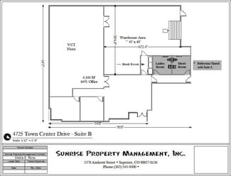 4725 Town Center Drive, Unit B offers 4,164 SF of professional flex space located in a strategic and accessible location near the South Powers corridor, just minutes from Peterson & Schriever Air Force Bases and the Colorado Springs Airport. The space features a welcoming reception area, two private offices, and a large open office/lab space that could easily be reconfigured into additional warehouse space to suit a variety of user needs. The warehouse section includes a high-clear-height open area with a drive-in overhead door; ideal for a variety of Tenants. Fenced yard space is also available, making it a rare find for businesses that require secure exterior storage or parking. This is a highly adaptable unit in a growth-focused submarket—call today for more information or to schedule a private tour.