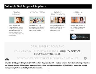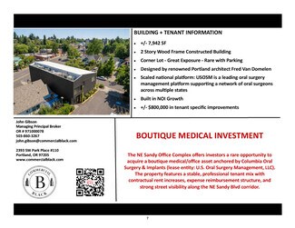 The NE Sandy Office Complex offers investors a rare opportunity to acquire a boutique medical/office asset anchored by Columbia Oral Surgery & Implants (lease entity: U.S. Oral Surgery Management, LLC). The property features a stable, professional tenant mix with contractual rent increases, expense reimbursement structure, and strong street visibility along the NE Sandy Blvd corridor.
