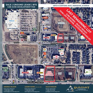 Now Listed For Sale, Lease & Build-to-Suit Ten Mile-McMillan -- Build-Ready pad site for sale, ground lease, and build to suit at Ten Mile and McMillan Roads, 0.88 acres - all utilities available to site. Join Jacksons Gas & C-Store, Mister Car Wash, Heartland Dental, Noodles & Co., Frontier Credit Union, & Les Schwab Tire Center. Potential uses include retail, restaurant, sale office or professional service provider type users. Surrounding tenants include Walmart, Icon Credit Union, Panda Express, Starbucks, Supercuts, Papa Murphy’s, Salon G, Westmark Credit Union, Labor Max Staffing, Gino’s Italian Ristorante, Rudy’s Pub & Grill, Four Seasons Spa & Pool, Gridiron Rehab & Fitness, Kvell Fitness & Nutrition, Dance Allegro Academy. Surrounded by new & proposed residential developments - located directly in the path of growth. High traffic location near the new Costco & WinCo Foods - 13,500 average daily traffic on Ten Mile Road.