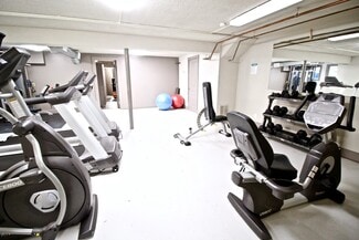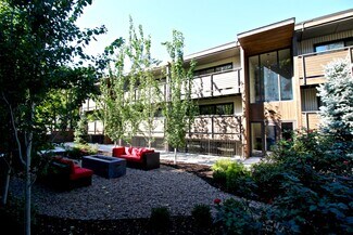 Each unit features upscale finishes including hardwood floors, granite counters, stainless steel appliances, plus an in-unit washer & dryer in most units. The property offers off-street parking, a fitness center, and a landscaped courtyard.