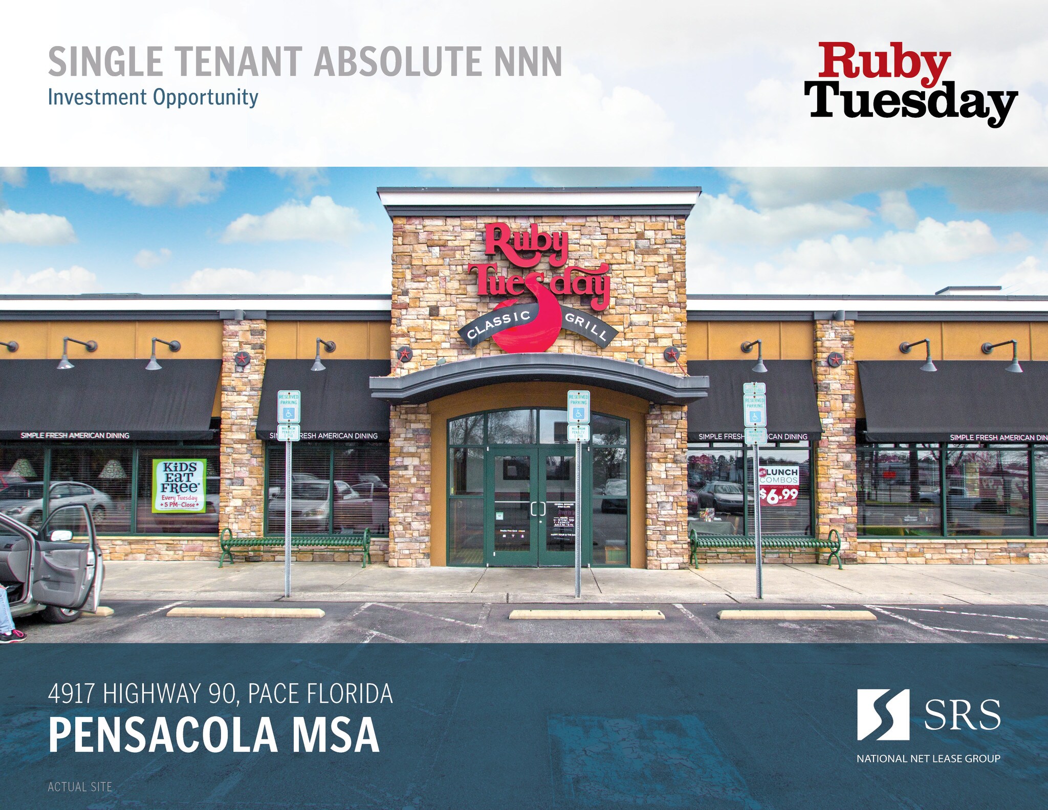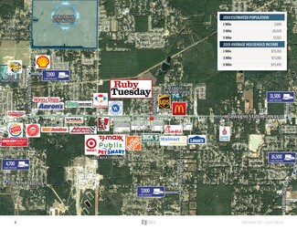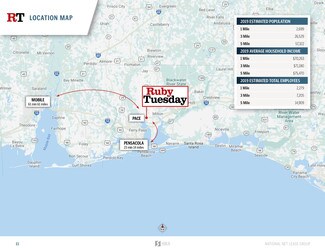 The subject property is strategically located along U.S. Highway 90/State Highway 10, a major thoroughfare traveling through the town of Pace, averaging 31,500 vehicles passing by daily. The property has excellent highway visibility with a large pylon sign, and multiple access points providing ease and convenience to customers. The subject property is located in a strong retail corridor that is experiencing continued growth with the construction of new retail developments including a brand new DICK’S Sporting Goods, and a Jimmy Johns, Five Guys, and Verizon strip center. Ruby Tuesday is ideally positioned as an outparcel to a 24-Hour Walmart Supercenter and Home Depot anchored shopping center. Other nearby national/credit tenants include Target, Publix, Lowe’s, T.J. Maxx, and more, further increasing consumer traffic to the trade area. The 5-mile trade area is supported by a population of more than 57,000 residents with an average household income of $75,500.