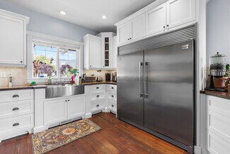 Inside, you’ll find a custom kitchen—complete with solid wood cabinetry, travertine tile backsplash, soft-close European glides, double ovens, and a double fridge. Reclaimed church floors throughout the main living spaces add warmth and authenticity rarely found in today’s builds.