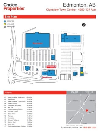Located at the corner of 50 Street and 137 Avenue, Clareview Town Centre benefits from high traffic counts and the draw of Real Canadian Superstore, Shoppers Drug Mart and Goodlife, and proximity to Costco, Walmart, Home Depot, and Safeway.