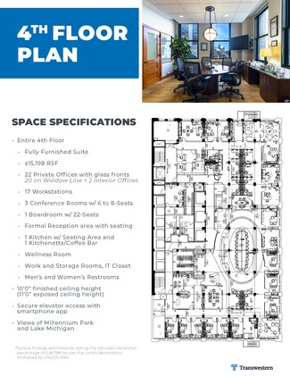 *Owner-occupied space. *Up to 16 deeded parking spaces available in the adjacent Heritage Bldg. Garage. *There is a separate entrance and lobby for Floors 2 through 5 at 50 E Washington St *24-hour door staff and security Plug & play, high-end, full-floor office condo with an interior staircase connecting the 4th and 5th floors (sold together or separately). Excellent owner-user opportunity. Entire 5th Floor: ±12,722 RSF 26 Private Offices w/ glass fronts (20 on Window Line and 6 Interior Offices) 6 Workstations w/ room to expand Interior Suite w/ Seating for 8 and Kitchenette 4 Conference Rooms w/ 6 to 8-Seats 1 Boardroom w/ 14-Seats and Dedicated Kitchen Open Kitchen and Abundant Soft Seating Fitness Room, Bike Closet, and Private Restroom w/ Shower Work and Storage Rooms, IT Closet Men's and Women's Restrooms 10’0” finished ceiling height (11’0” exposed ceiling height)