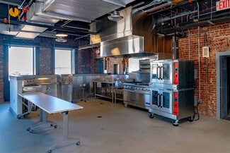 The space blends character and functionality, featuring hardwood floors throughout, open floor plans, and exposed ceilings with heights ranging from 12 to 16 feet. Large windows provide abundant natural light and sweeping views of New York City, while bathrooms with private showers and abundant off-street parking enhance the daily workplace experience.
