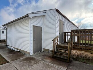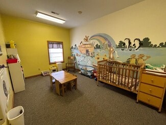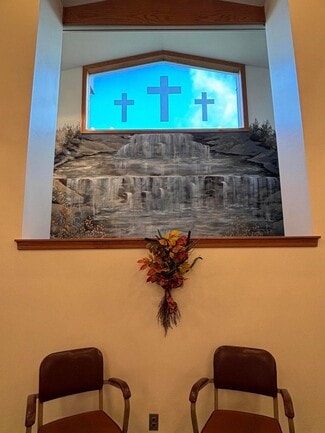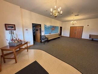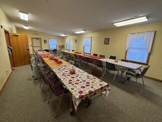 Church on 5 acres of land, 2 parcels. Main building contains foyer, office, session room, sanctuary, reception hall, kitchen, 2 bath areas, nursery room, patio and storage 4940 sq ft. Additional Building 864 Sq Ft set on block foundation has full unfinished walk up and internal stairs to basement, hall and 3 session rooms. Propane F/A heat main building- tank rented and C/A. Building 2 baseboard heat and window A/C.