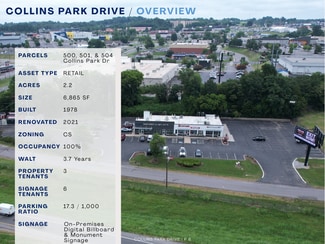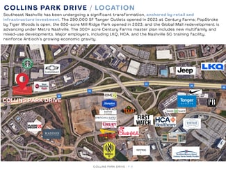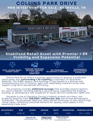 Collins Park Drive offers a premier opportunity to acquire a stabilized retail asset with outstanding I-24 visibility in the heart of Southeast Nashville. The 6,865-square-foot building is fully leased to a diverse and complementary mix of tenants, each with separately metered suites that support long-term operational efficiency.