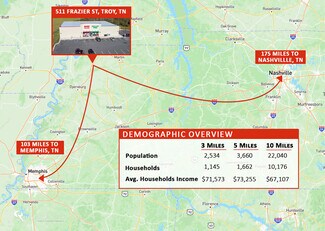 Troy, a town in Obion County, is located in the northwest corner of Tennessee. Obion County is among the top five corn producing counties in the state. Troy is just over 26 miles north of Dyersburg, TN, approximately 93 miles south of Cape Girardeau, MO and approximately 108 miles northeast of Memphis. The population within a 7-mile radius is 6,638 with an average household income of $73,413.