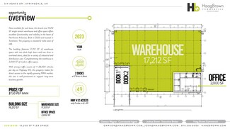 Now available for sublease, this 19,212 SF single tenant industrial flex space offers the perfect opportunity to support local and regional business growth in Northwest Arkansas. Built in 2023, the property features 17,212 SF of warehouse space with 20' clear heights and 2,000 SF of modern office space, making it ideal for a wide range of industrial, distribution, and light manufacturing uses. Located just off Highway 412(28,000 VPD), the space provides excellent connectivity to I-49 and the broader Northwest Arkansas market. This brand-new facility delivers efficiency, visibility, and access in one of the region’s fastest growing industrial corridors in NWA.