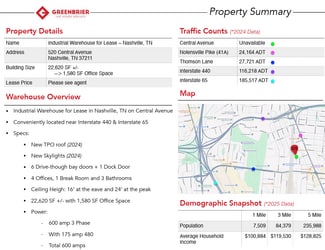 Conveniently located near Interstate 440 & Interstate 65 • New TPO roof (2024) • New Skylights (2024) • 6 Drive-though bay doors + 1 Dock Door • 4 Offices, 1 Break Room and 3 Bathrooms • Ceiling Heigh: 16’ at the eave and 24’ at the peak • 22,620 SF +/- with 1,580 SF Office Space • Power: 600 amp 3 Phase / With 175 amp 480 / Total 600 amps