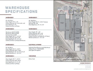 • Highly Functional Multi-Warehouse Complex – The property features 7 warehouses ranging from 103,234 sq. ft. to 225,319 sq. ft., with clear heights from 18 feet to 33’3” and 20 docks on 58.08 acres. Each building is equipped with energy-efficient LED lighting, Phase 3 power, and individual panel boxes, delivering flexibility and reliability for diverse industrial operations.