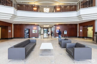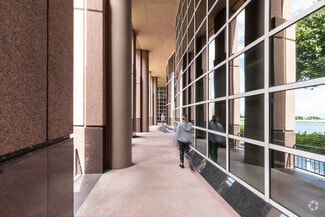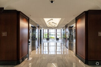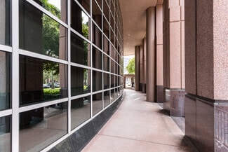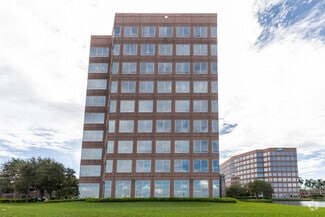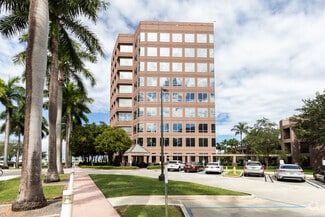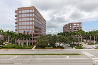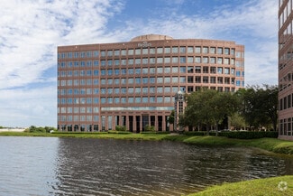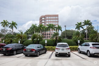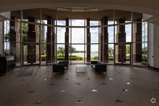 Exterior of the building is clad in rose-colored precast panels with an exposed stone finish, polished granite accents, and silver-blue reflective glass windows. Column free floors provide flexible interior planning and panoramic views of the Lakes of Blue Lagoon and Miami International Airport.