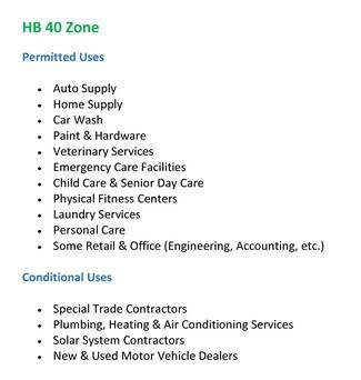 Variety of permitted and conditional uses HB 40 Zone Including