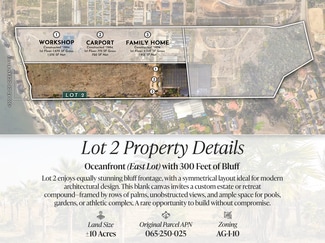 The Shoreline Subdivision is a rare ±32-acre oceanfront opportunity with 600 feet of blufftop frontage in Santa Barbara County. Currently under review as a 3-lot subdivision (TPM 24TPM-00003), each parcel is zoned AG-I-10 within the Coastal Zone, allowing one primary residence, a 1,200 SF ADU, an 800 SF guest house, plus barns, greenhouses, equestrian facilities, and hobby agriculture. Water is provided via Goleta Water District with ag credits preserved. A 45' access and utility easement will be recorded with the final map. Fire access is approved; septic testing required per parcel. Structures over 20,000 SF may require a Development Plan. Daily whale, dolphin, and raptor sightings enrich the natural setting. Final map expected late 2025; all configurations subject to County approval.