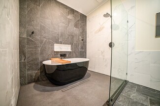 Modern 2023 construction in a great location on a private 1.3-acre wooded lot just 5 minutes from downtown Eureka Springs and less than a mile from mountain biking trails. This unique 2 bed/2 bath property features a primary bedroom with two walk-in closets and a main-level bonus room off the garage that offers flexibility for 3rd sleeping space, office, or gym. Modern finishes include quartz countertops, porcelain tile floors throughout, radiant floor heat, and a freestanding tub in the primary bath. Large garage adds flexibility with a bonus loft space. Commercial zoning allows nightly rental or multi-use. Some finishing details remain for customization.