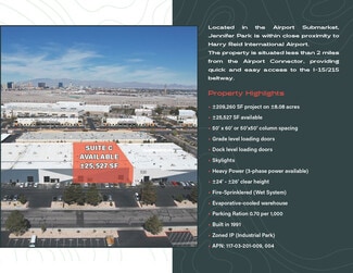Located in the Airport Submarket, Jennifer Park is within close proximity to Harry Reid International Airport. The property is situated less than 2 miles from the Airport Connector, providing quick and easy access to the I-15/215 beltway. For more information or to schedule a tour please contact Lauren Willmore at 702-369-4825 or Kyle Kirchmeier at 702-369-4862. ±209,260 SF project on ±8.08 acres ±25,527 SF Unit - NOW AVAILABLE! LEASE RATE: $1.30/SF (NNN) NNN: $0.1955/SF TOTAL MONTHLY: $38,176 50' x 60' column spacing Grade-Level Truck Loading Dock-hi truck loading Heavy Power (3-Phase Power Available) 24’ - 26’ clear height Fully fire-sprinklered Year Built: 1991 Evaporative-cooled warehouse Concrete tilt-up construction Zoned: IP (Industrial Park) APNs: 177-03-201-009, 177-03-201-004