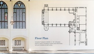 Recent capital improvements exceeding $2 million include major infrastructure upgrades, a new multi-level elevator, select interior restorations, and a new architectural shingle roof scheduled for installation in 2025. The building’s soaring sanctuary features 60-foot vaulted ceilings, stained-glass windows, and an open floor plan suitable for large gatherings or creative redevelopment.