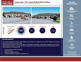 This (Under-Construction) medical / office building is projecting to be completed by end of 2023! Parking lot shared with The Women's Group of Tampa. Ideally situated in the heart of one of the region' s most affluent communities, Tampa Palms Professional Center offers a desirable location fronting I-75 (at Exit 270) and the comprehensive retail, restaurant and service amenities along the Bruce B. Downs Boulevard commercial corridor. TI Available upon request and terms. - 4 Suites Available. Can combine suites for additional square footage. - Parking lot completed and shared with The Woman's Group of Tampa (#1 OBGYN Office in Tampa) - Beautiful upscale medical district - Perfect for dental, chiropractor, medical groups, surgery centers, attorney, upscale office space, and eye doctors! - Brand new constructions with build-to-suite options available - Long term leases available The location is enhanced by construction of the I-75 flyover connecting New Tampa Boulevard and Cross Creek Boulevard to the Center' s front door. Medical, Specialty Dentist / Dental , Office Space, MRI Centers, Attorney, Law, Eye Doctor Doctors, Plastic Surgeons, LAB, Veterinarian, Plus MORE!