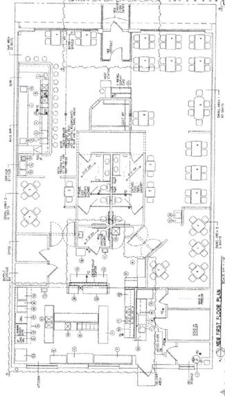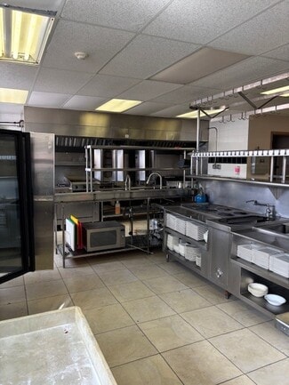 The commercial kitchen is well-equipped to support high-volume operations, featuring a 14-foot black-iron exhaust hood, a gas-fired make-up air system, and a dedicated dishwasher hood. Additional infrastructure includes a 75-gallon gas-fired Rheem water heater, in-floor grease interceptors, and robust 600-amp, 3-phase electrical service. The layout incorporates generous prep space with stainless steel prep tables, multiple prep sinks and hand sinks, a utility closet, two walk-in coolers, and ample dry storage.