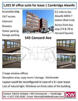 545 Concord Ave is an accessible Class B office property, that went under renovations in 2021 and now boasts new full bathrooms. The property features garage parking and visitor parking on site. Tenants and guest are in close proximity to three bus stops (Harvard Yard), a 12-minute walk from the Alewife T station on the MBTA Red Line, and an 18 min drive from the Logan International Airport. Ideal location for employees and clients to access Starbucks, Whole Foods, Ma Magoo's, Dunkin', Chipotle, McDonald's, Trader Joe's, CVS Pharmacy, PetSmart, LaundroMutt, Core Power Yoga, Evolve Fitness, Central Rock Gym, Apple Cinemas, Freepoint Hotel. Parks and recreation nearby include Daheny Park, Lusitania Field, Kingsley Park, and the Fresh Pond Golf Course. The property is currently zoned as BC, Cambridge.