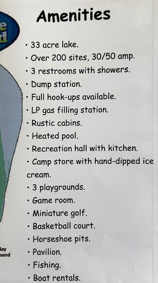 • Heated pool, game room, miniature golf, basketball court, horseshoe pits, 3 playgrounds, camp store.