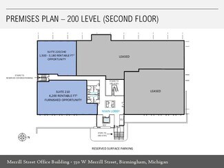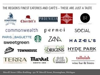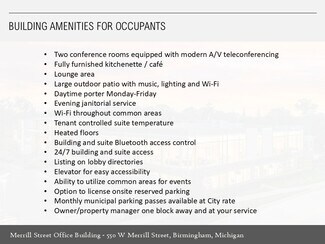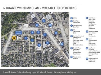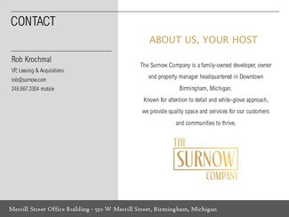 The Merrill Street Office Building is downtown Birmingham's signature boutique multi-tenant office property showcasing first-class finishes, abundant common area amenities usable with your tenancy (common conference room, board room, kitchen, café, lounge, outdoor patio, WiFi, Sonos streaming music), onsite reserved executive parking, largest municipal parking deck directly adjacent, and white-glove management and ownership by The Surnow Company with their headquarters one block away. The building was fully reconstructed and modernized with a 2014 opening and sports floor to ceiling perimeter glass, flexible zoned heating and cooling systems, efficient lighting, stunning interior design, soaring light-filled main lobby, floating signature staircase, along with an excellent co-tenancy. Every detail of our Merrill Street Office Building from its aesthetics, joy of office and amenity use, and second-to-none service offers owners and employees a one-of-a-kind experience helping to recruit and retain top talent and WOW prospective clients, existing clients and visitors. We look forward to hosting you on a tour and learning more about you and your company at your convenience.