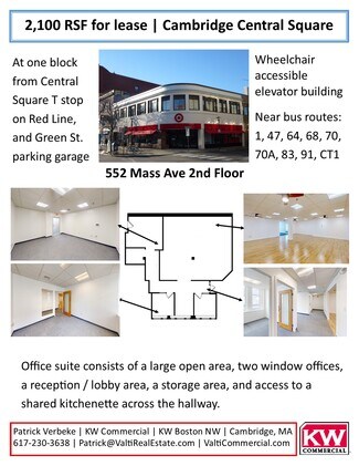 Cambridge Central Square is located between MIT and Harvard. 552 Mass Ave is located at the corner of Mass Ave and Pearl Street, at one block from the Cambridge Central Square T station on the MBTA Red line.